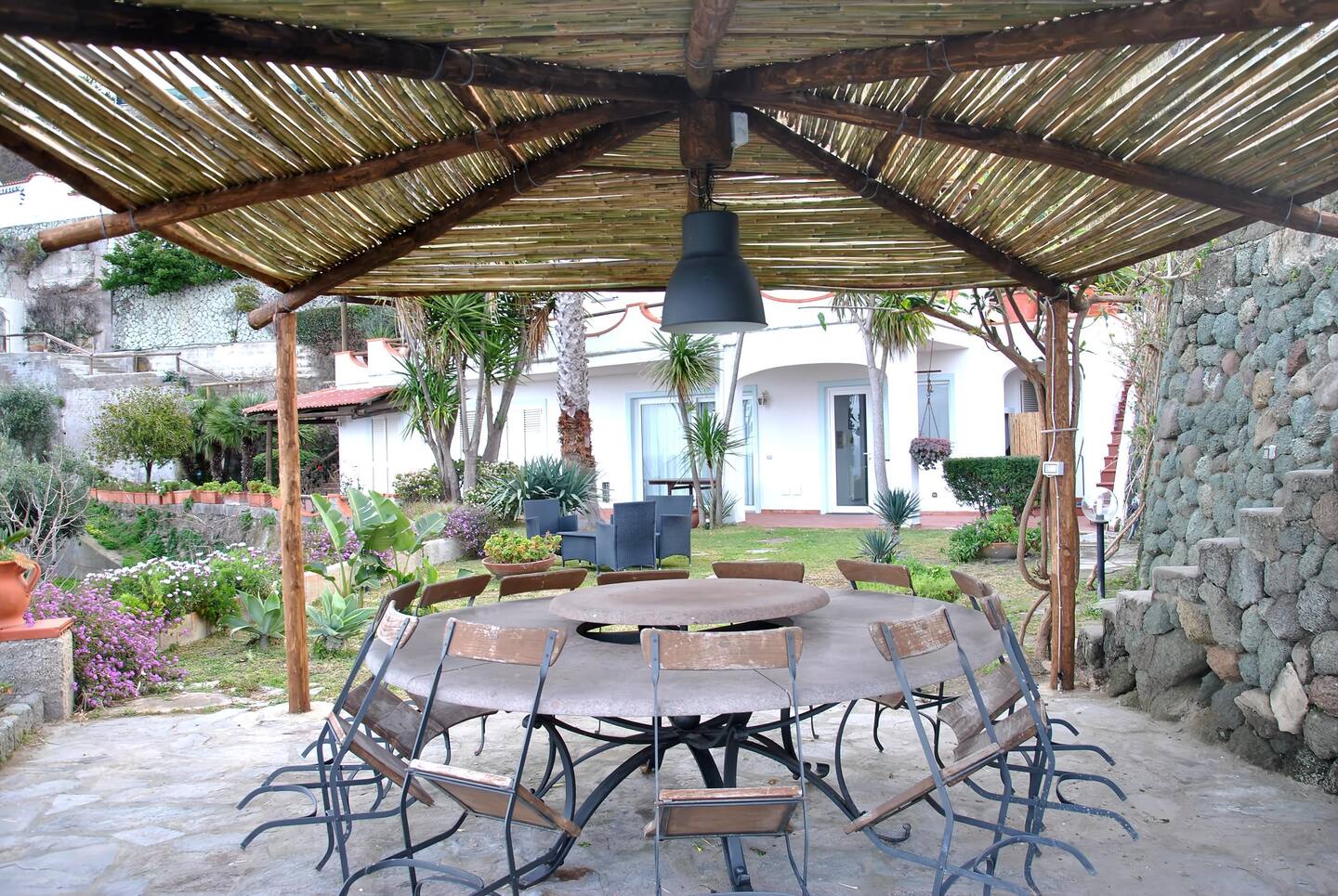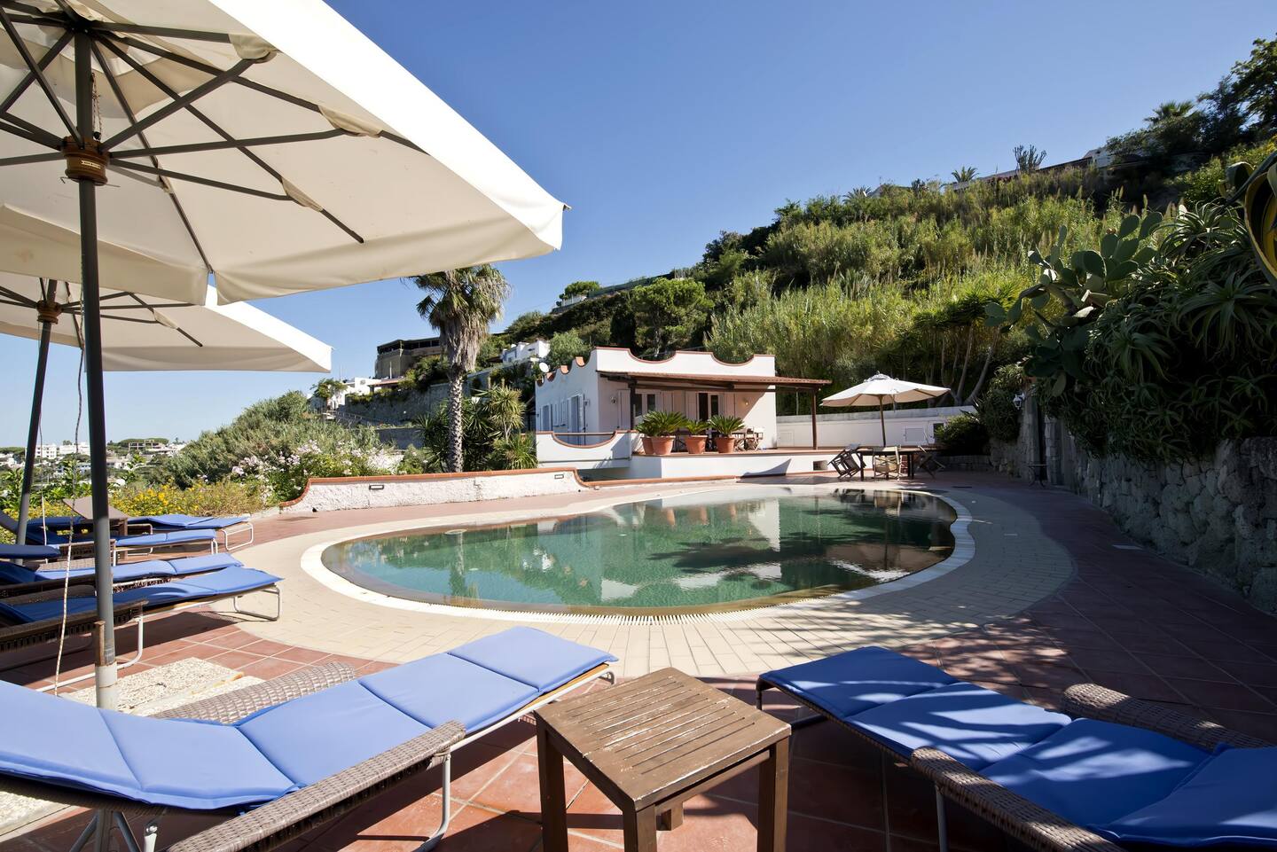 Vari angoli silenziosi, freschi gazebo, ombrelloni e lettini tra le palme consentono completo relax. La villa è fornita anche di piscina termale e sauna naturale. Internet wifi gratuito. Salotto, cucina  completa, lavanderia.